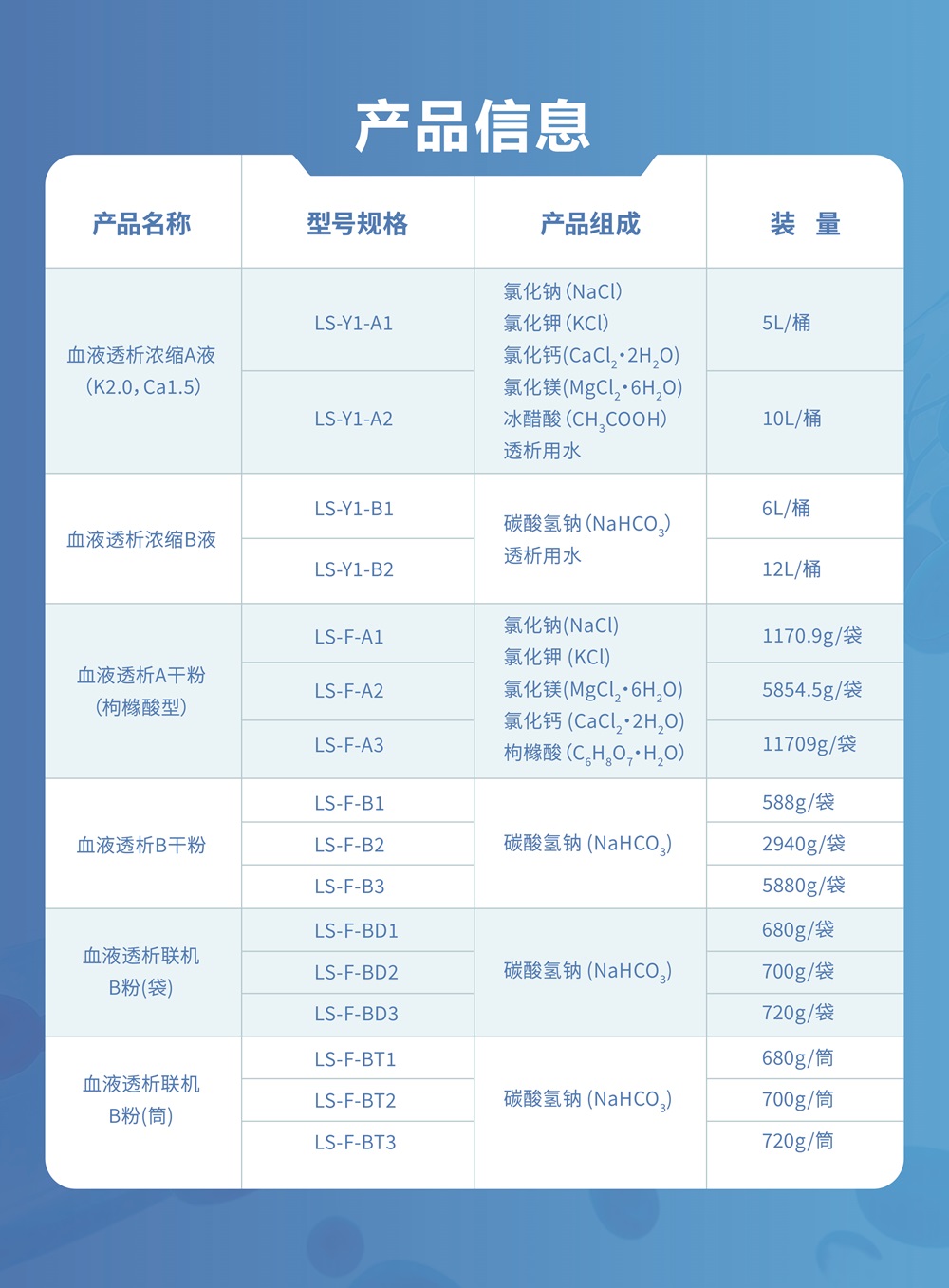血液透析濃縮液(粉)屬于血液透析機的輔助材料,用于急性腎衰竭、慢性腎衰竭的血液透析治療借助透析器清除體內代謝廢物,維持水、電解質和酸堿平衡等。