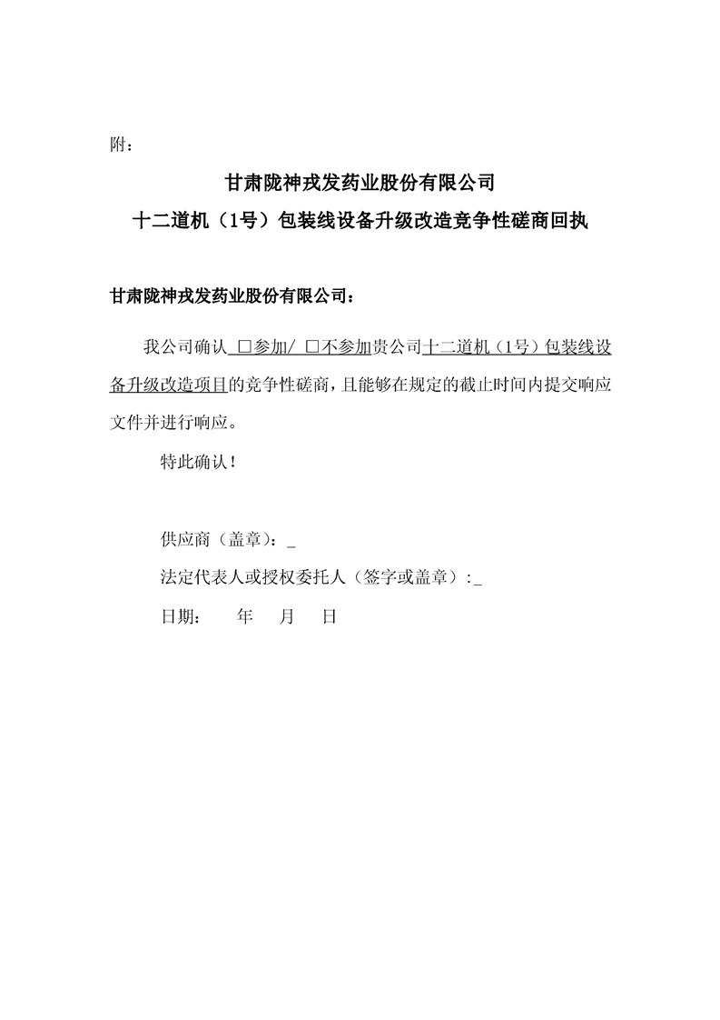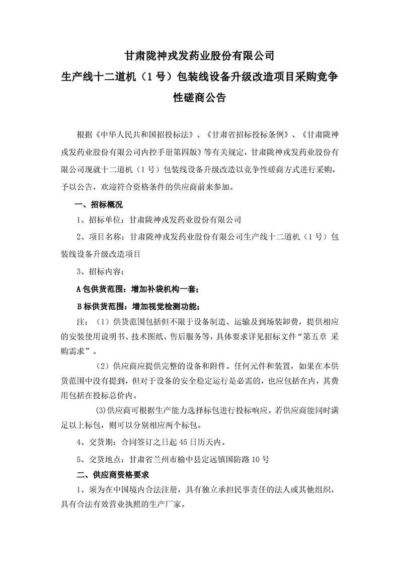 甘肅隴神戎發(fā)藥業(yè)股份有限公司生產(chǎn)線十二道機(1號)包裝線設(shè)備升級改造項目采購競爭性磋商公告