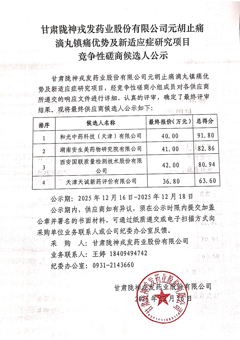 甘肅隴神戎發(fā)藥業(yè)股份有限公司元胡止痛滴丸鎮(zhèn)痛優(yōu)勢及新適應(yīng)癥研究項目競爭性磋商候選人公示
