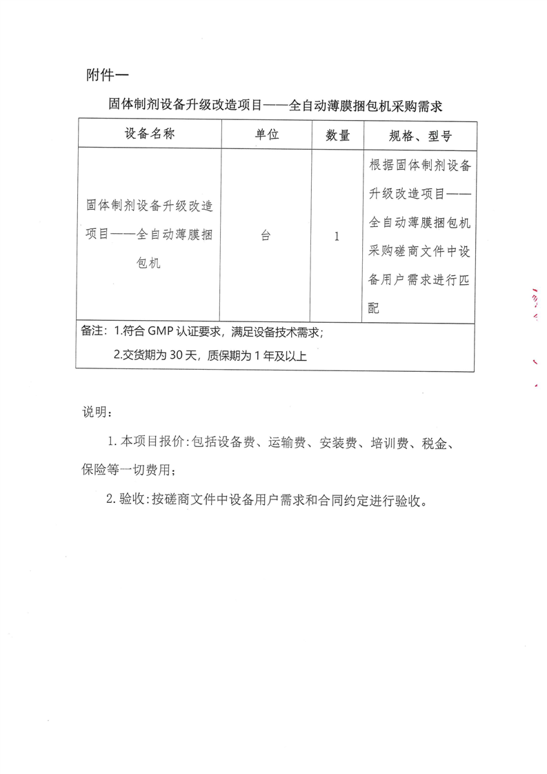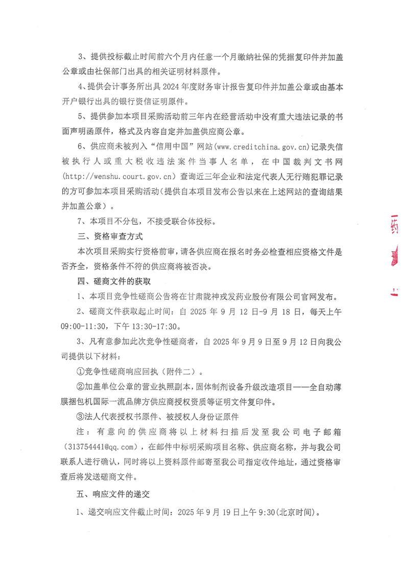 甘肅隴神戎發(fā)藥業(yè)股份有限公司固體制劑設(shè)備升級(jí)改造項(xiàng)目--全自動(dòng)薄膜捆包機(jī)采購(gòu)競(jìng)爭(zhēng)性磋商公告