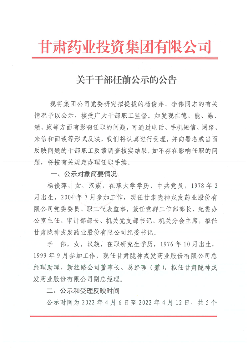 甘肅藥業(yè)投資集團(tuán)有限公司關(guān)于干部任前公示的公告