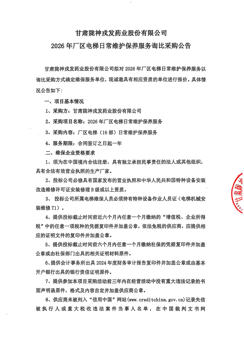 甘肅隴神戎發(fā)藥業(yè)股份有限公司2026年廠區(qū)電梯日常維護(hù)保養(yǎng)服務(wù)詢比采購(gòu)公告