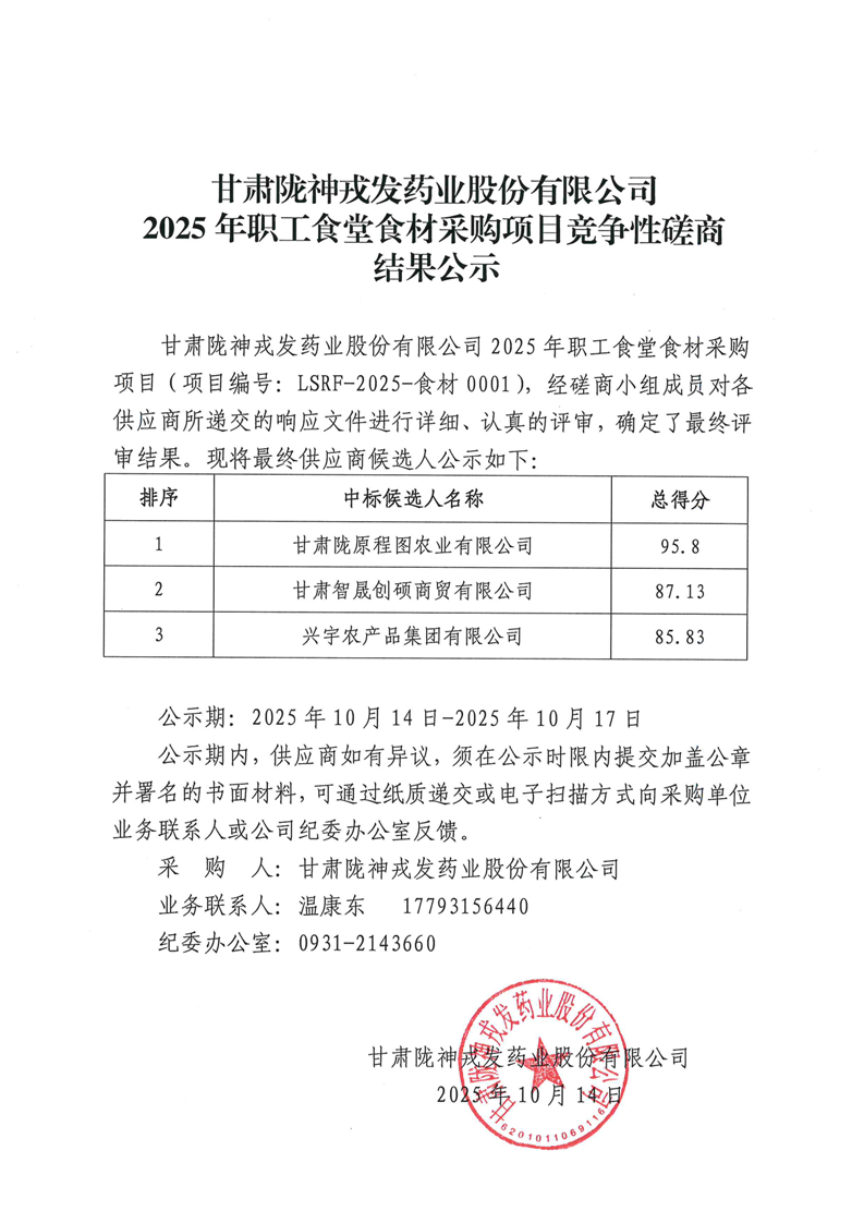 甘肅隴神戎發(fā)藥業(yè)股份有限公司2025年職工食堂食材采購項目競爭性磋商結(jié)果公示