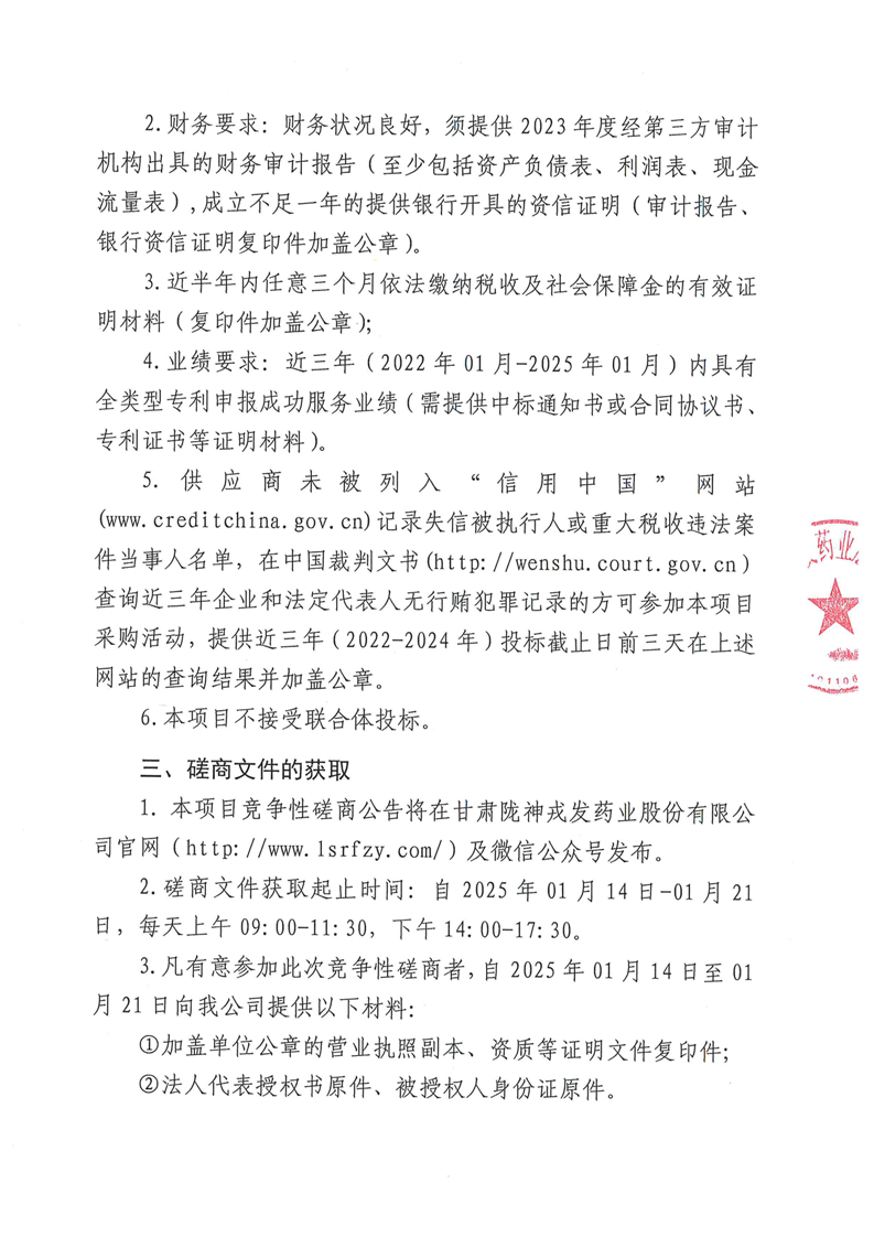 甘肅隴神戎發(fā)藥業(yè)股份有限公司專利申請服務(wù)機(jī)構(gòu)采購項(xiàng)目競爭性磋商公告