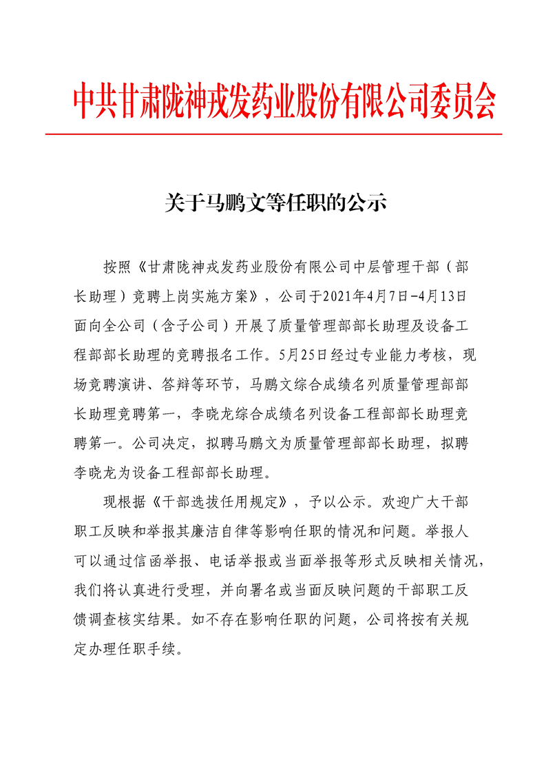 關(guān)于馬鵬文等任職的公示