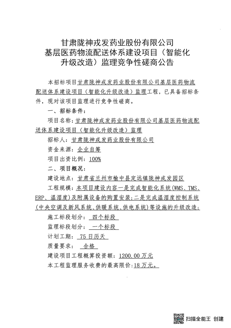 甘肅隴神戎發(fā)藥業(yè)股份有限公司基層醫(yī)藥物流配送體系建設項目(智能化升級改造)監(jiān)理競爭性磋商公告
