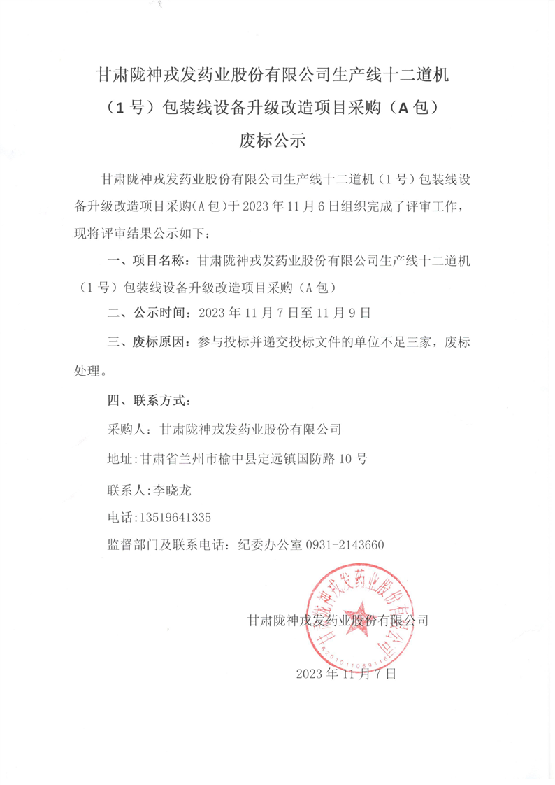 甘肅隴神戎發(fā)藥業(yè)股份有限公司生產(chǎn)線十二道機(jī)(1號)包裝線設(shè)備升級改造項(xiàng)目采購(A包)廢標(biāo)公示