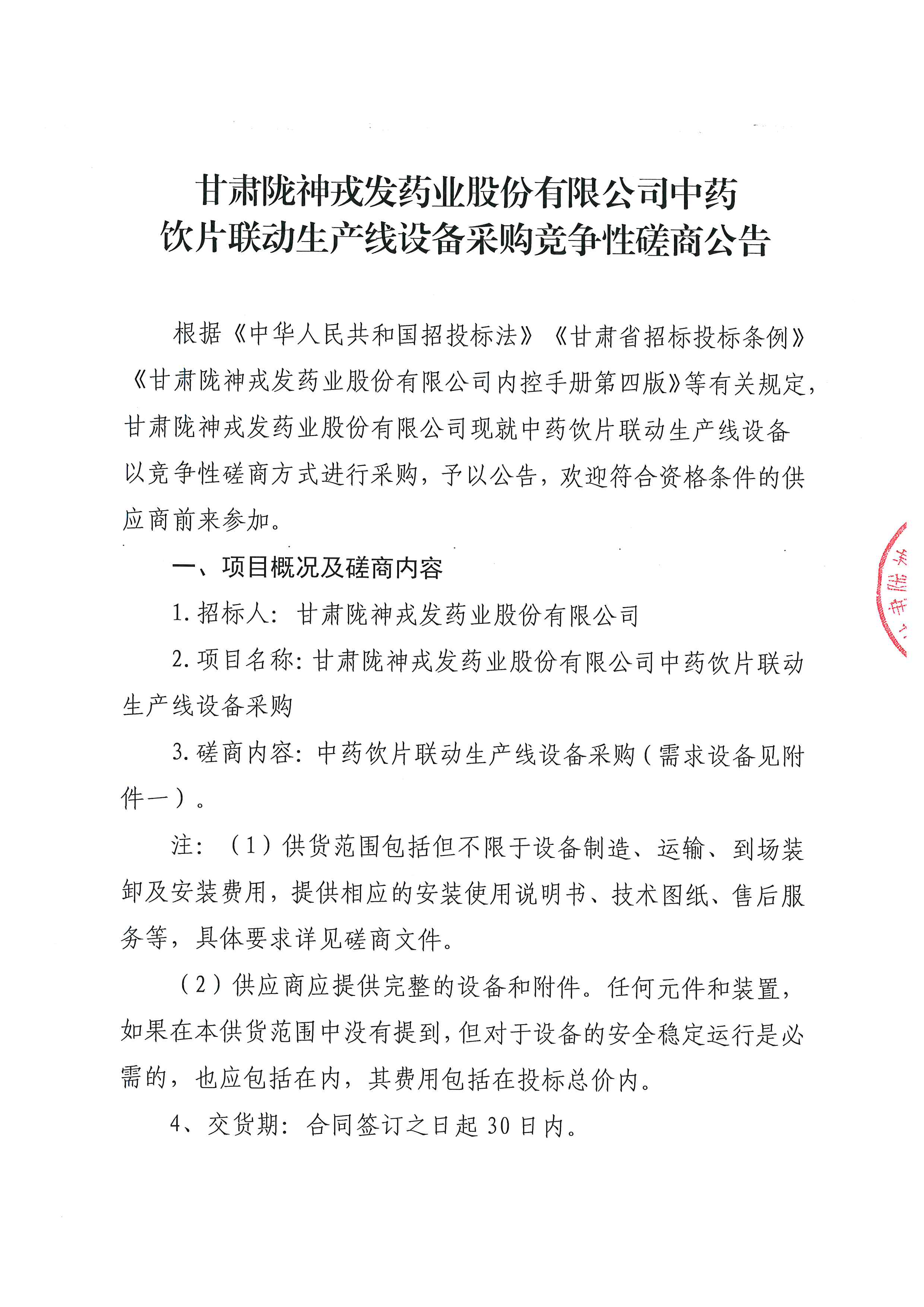 甘肅隴神戎發(fā)藥業(yè)股份有限公司中藥飲片聯(lián)動生產(chǎn)線設(shè)備采購競爭性磋商公告