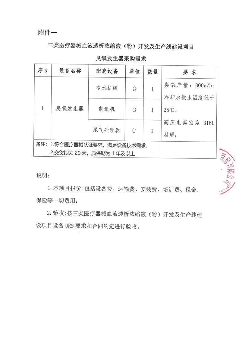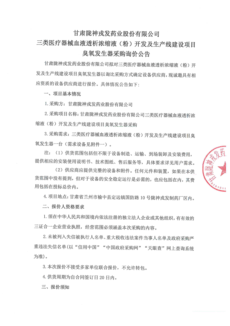 甘肅隴神戎發(fā)藥業(yè)股份有限公司三類醫(yī)療器械血液透析濃縮液(粉)開發(fā)及生產(chǎn)線建設(shè)項(xiàng)目臭氧發(fā)生器采購(gòu)詢價(jià)公告