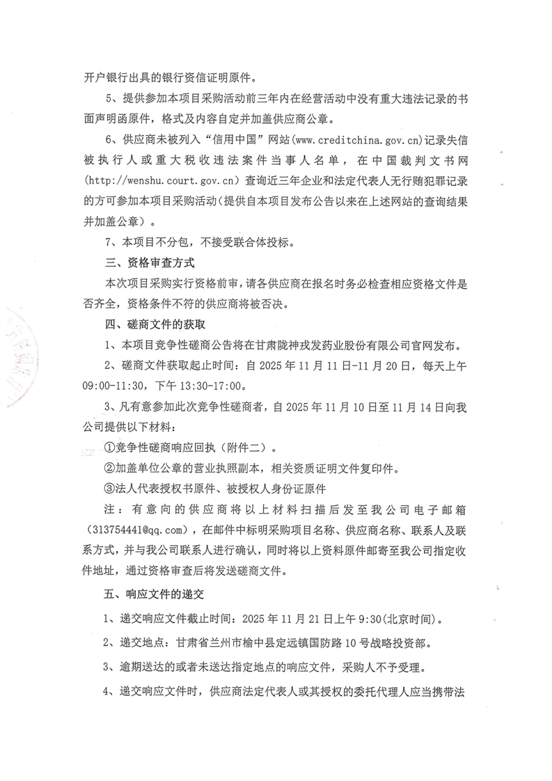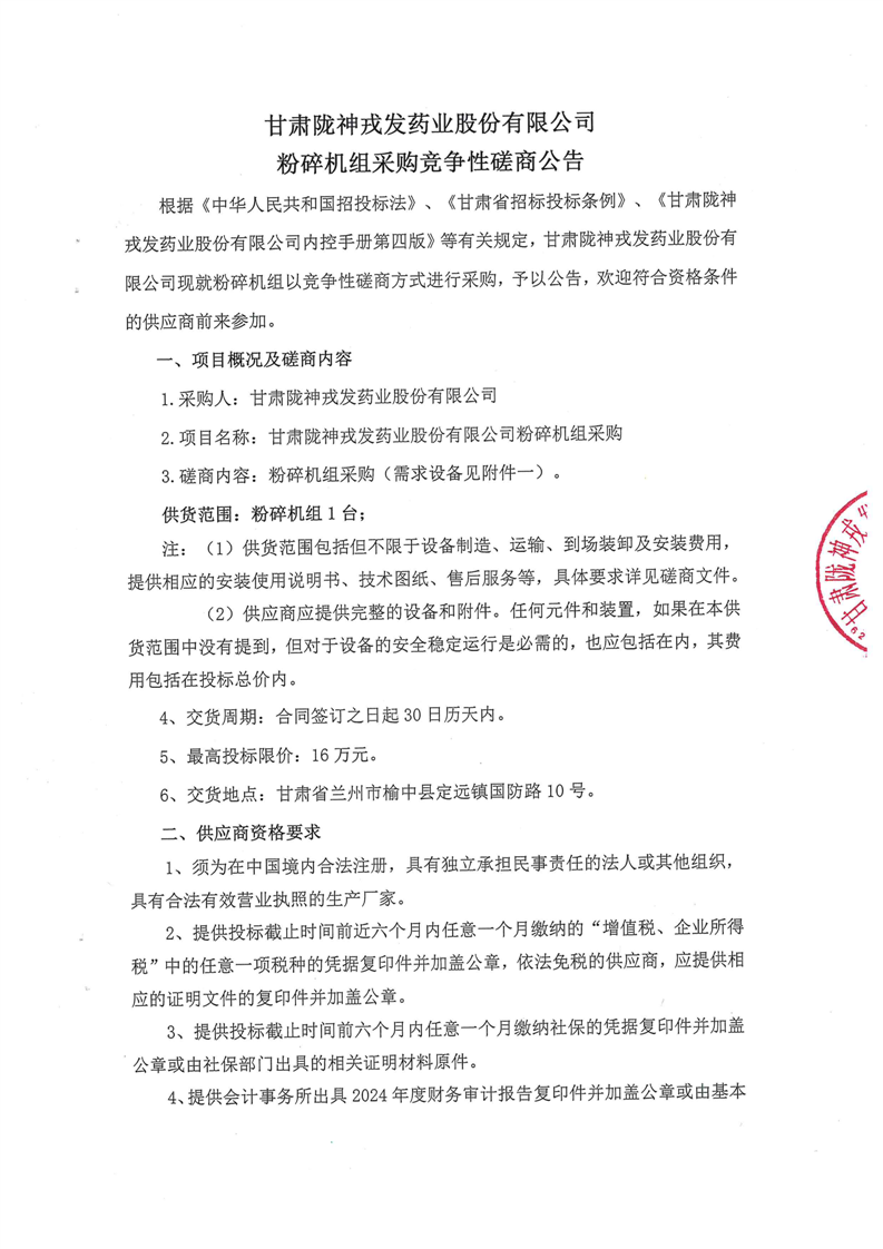 甘肅隴神戎發(fā)藥業(yè)股份有限公司粉碎機(jī)組采購競爭性磋商公告
