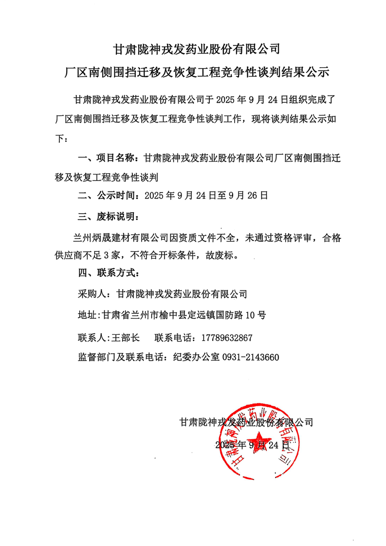甘肅隴神戎發(fā)藥業(yè)股份有限公司廠區(qū)南側(cè)圍擋遷移及恢復(fù)工程競(jìng)爭(zhēng)性談判結(jié)果公示