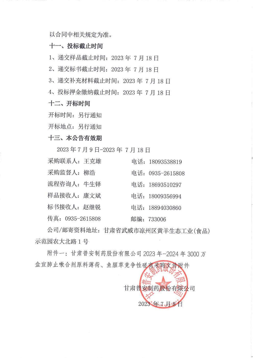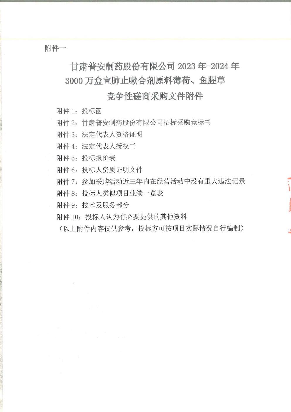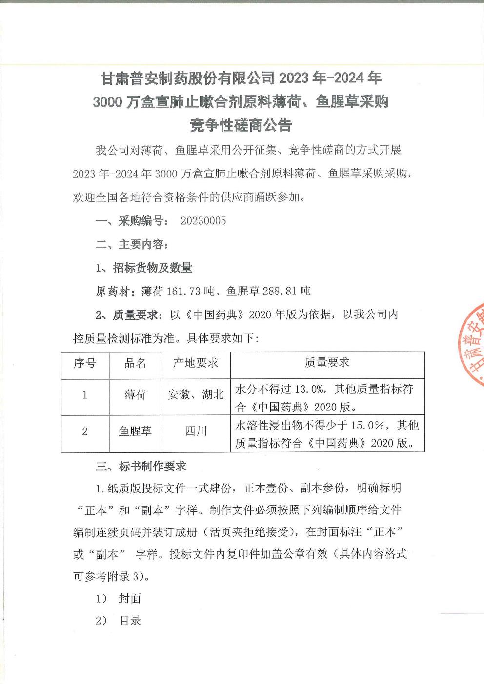 甘肅普安制藥股份有限公司 2023 年-2024年3000 萬(wàn)盒宣肺止嗽合劑原料薄荷、魚(yú)腥草采購(gòu)競(jìng)爭(zhēng)性磋商公告