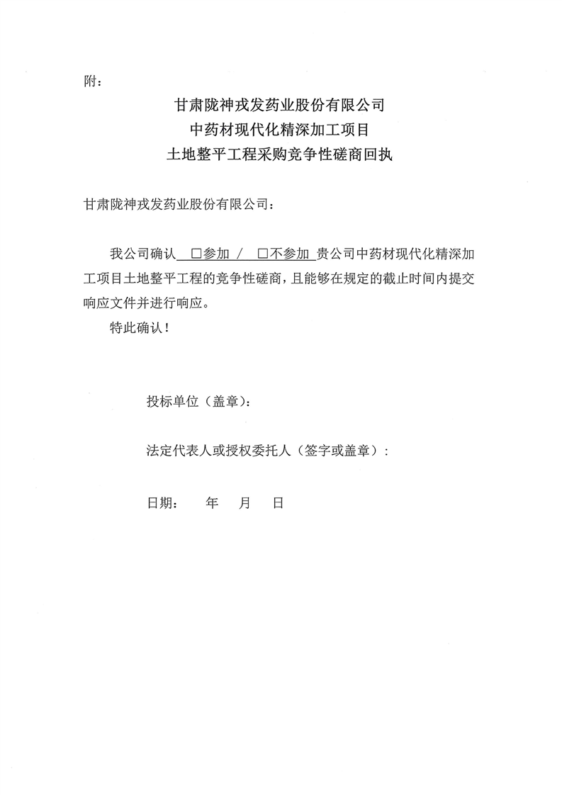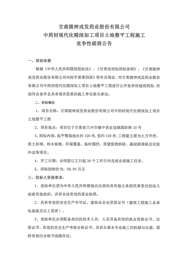 甘肅隴神戎發(fā)藥業(yè)股份有限公司中藥材現(xiàn)代化精深加工項目土地整平工程施工競爭性磋商公告