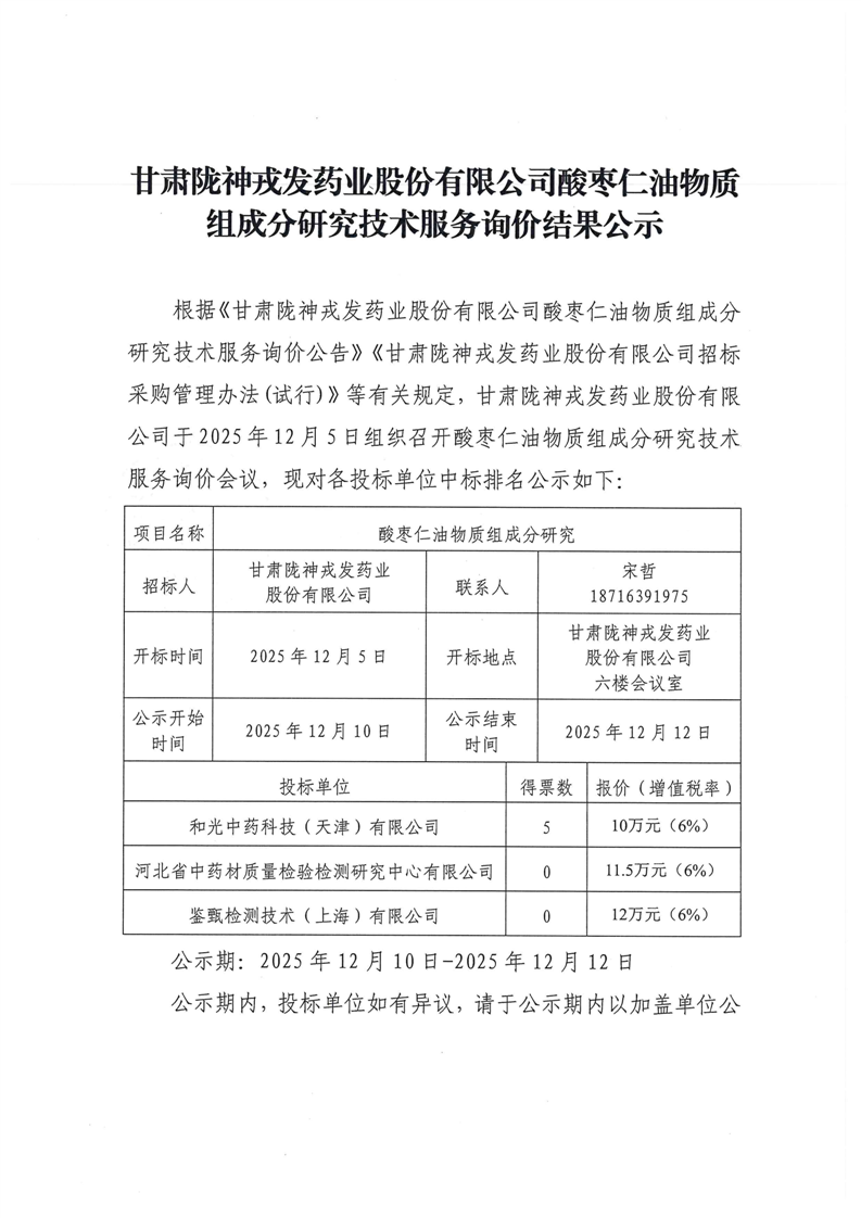 甘肅隴神戎發(fā)藥業(yè)股份有限公司酸棗仁油物質(zhì)組成分研究技術(shù)服務(wù)詢價(jià)結(jié)果公示