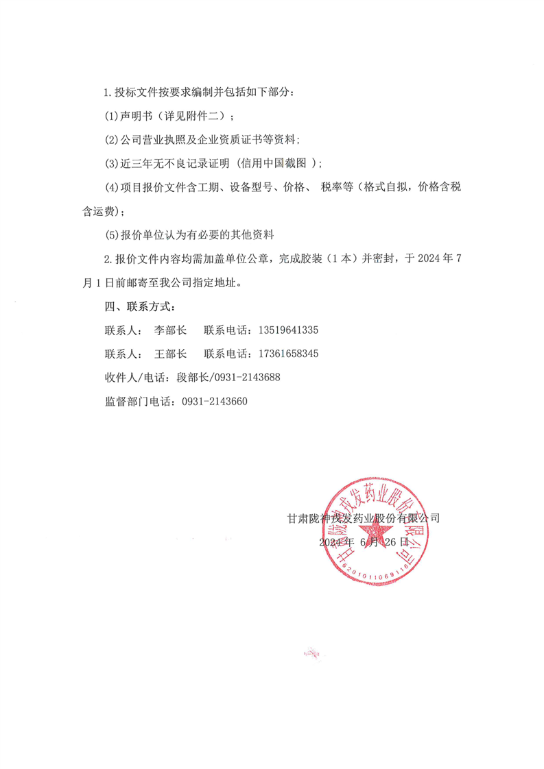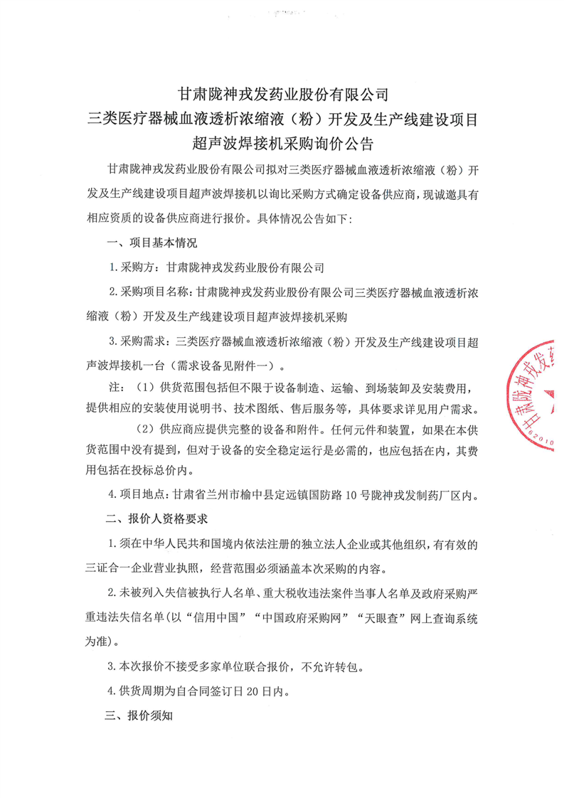 甘肅隴神戎發(fā)藥業(yè)股份有限公司三類醫(yī)療器械血液透析濃縮液(粉)開發(fā)及生產(chǎn)線建設項目超聲波焊接機采購詢價公告