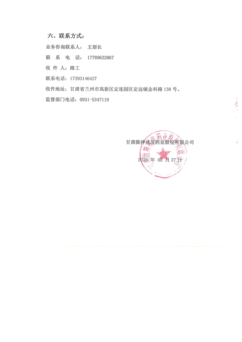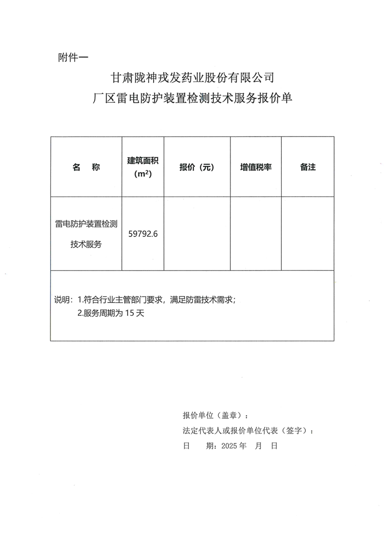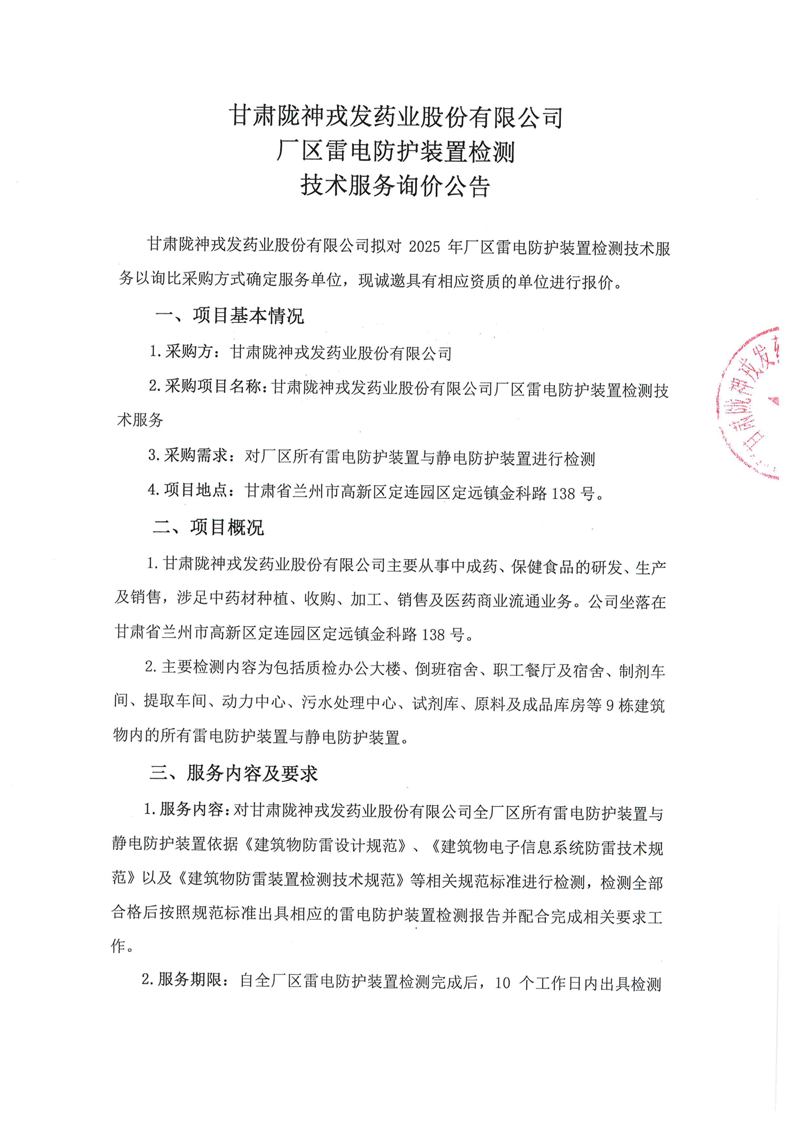 甘肅隴神戎發(fā)藥業(yè)股份有限公司廠區(qū)雷電防護裝置檢測技術(shù)服務(wù)詢價公告