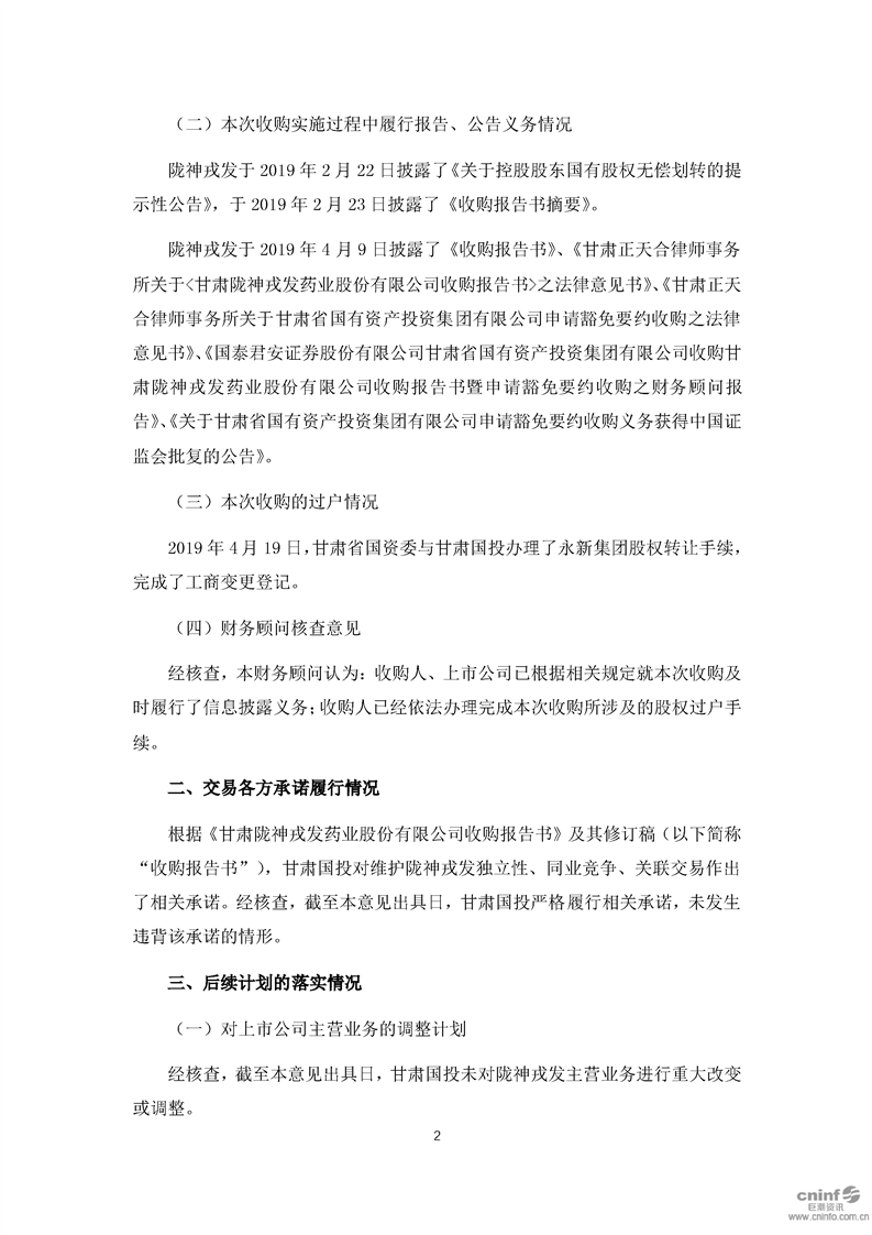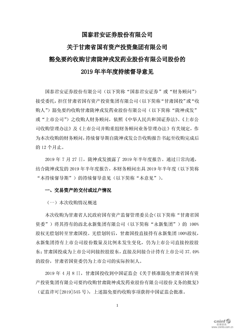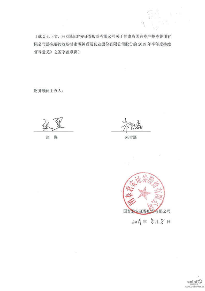 國泰君安證券股份有限公司關于甘肅省國有資產(chǎn)投資集團有限公司豁免要約收購公司股份的2019年半年度持續(xù)督導意見