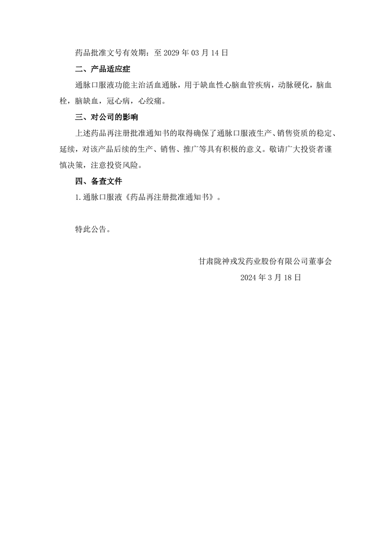 關(guān)于通脈口服液獲得藥品再注冊(cè)批準(zhǔn)的公告
