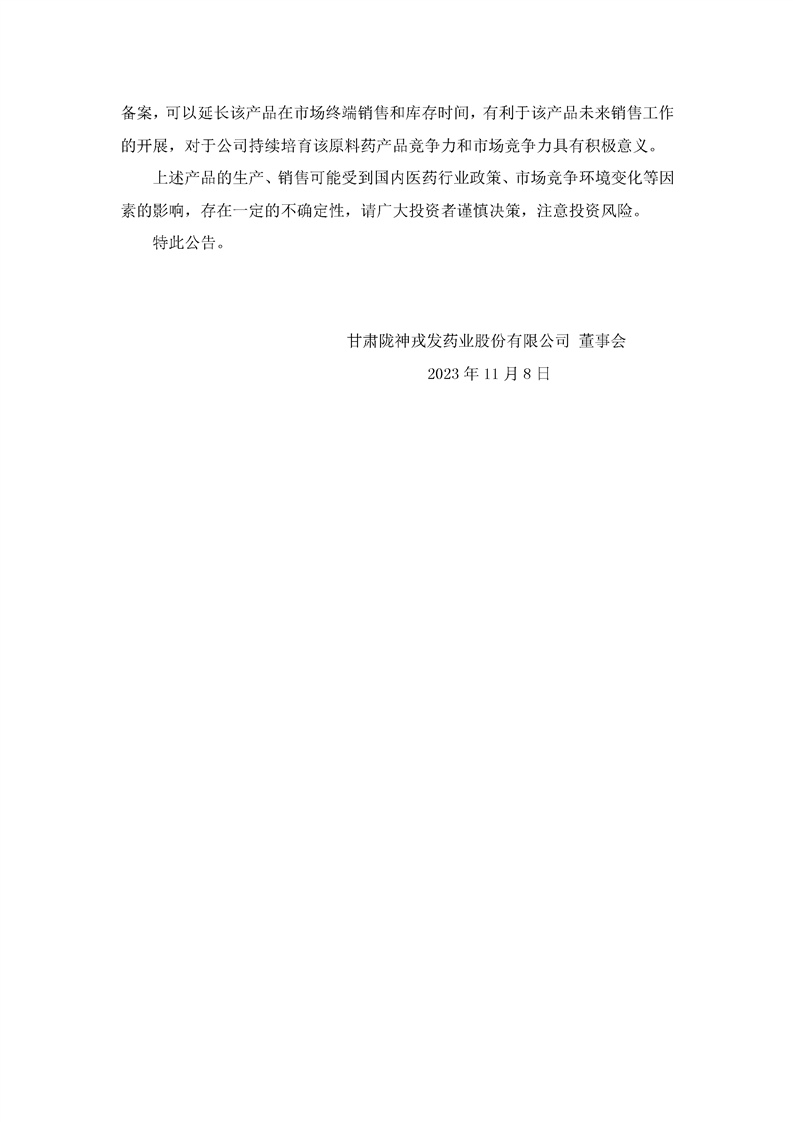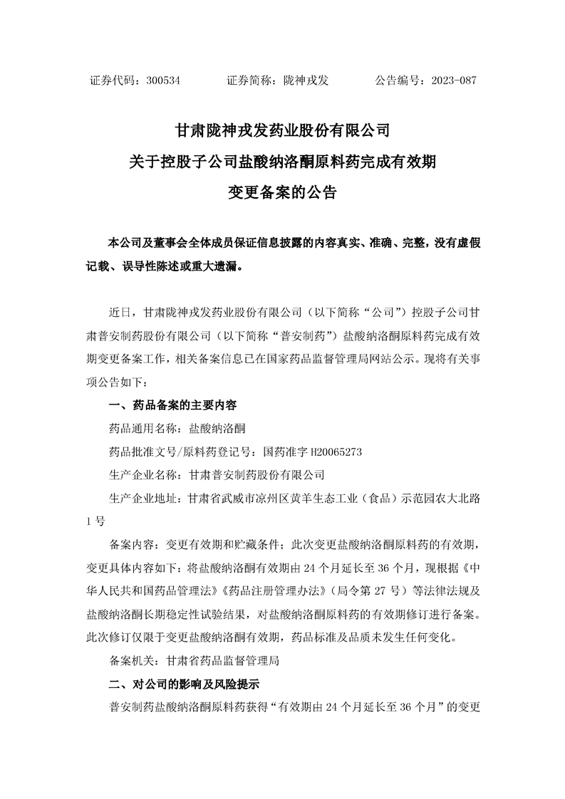 關于控股子公司原料藥鹽酸納洛酮完成有效期變更備案的公告