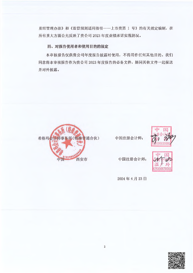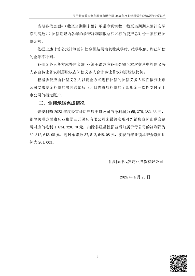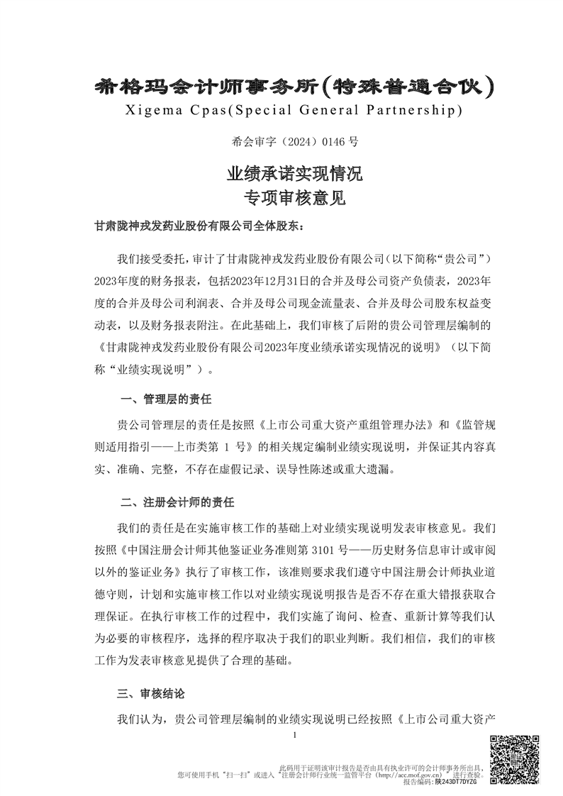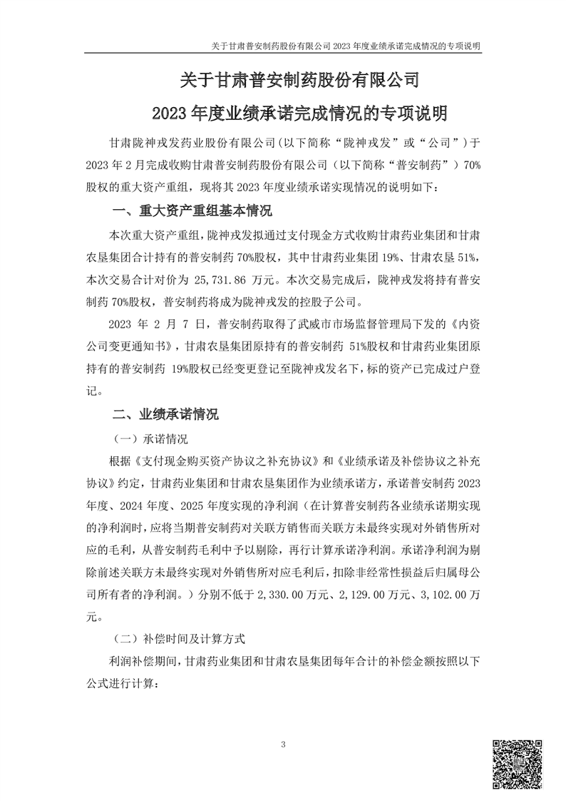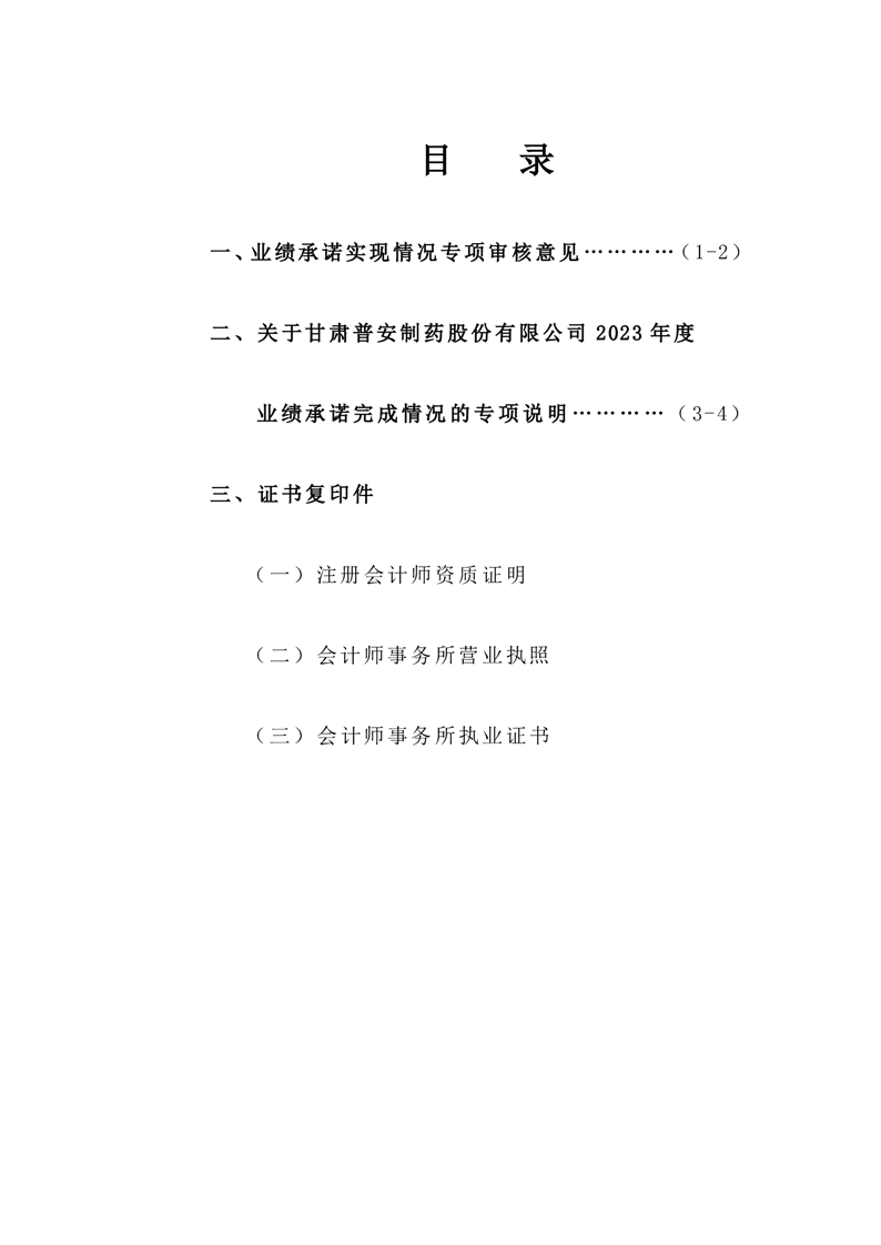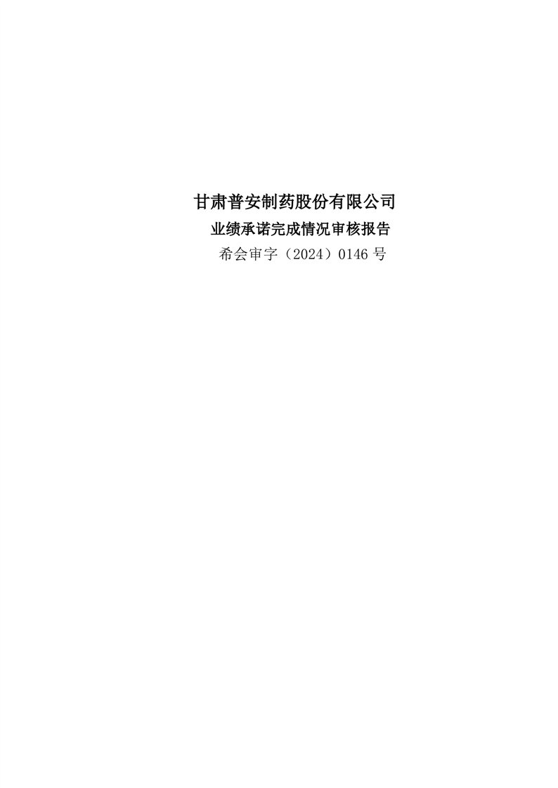 甘肅普安制藥股份有限公司業(yè)績承諾完成情況審核報告