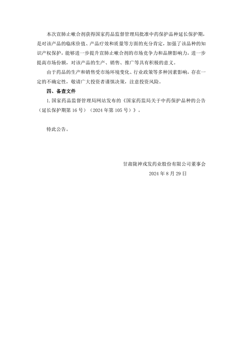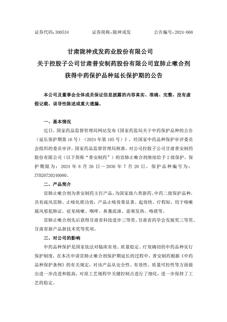 關(guān)于控股子公司甘肅普安制藥股份有限公司宣肺止嗽合劑獲得中藥保護品種延長保護期的公告
