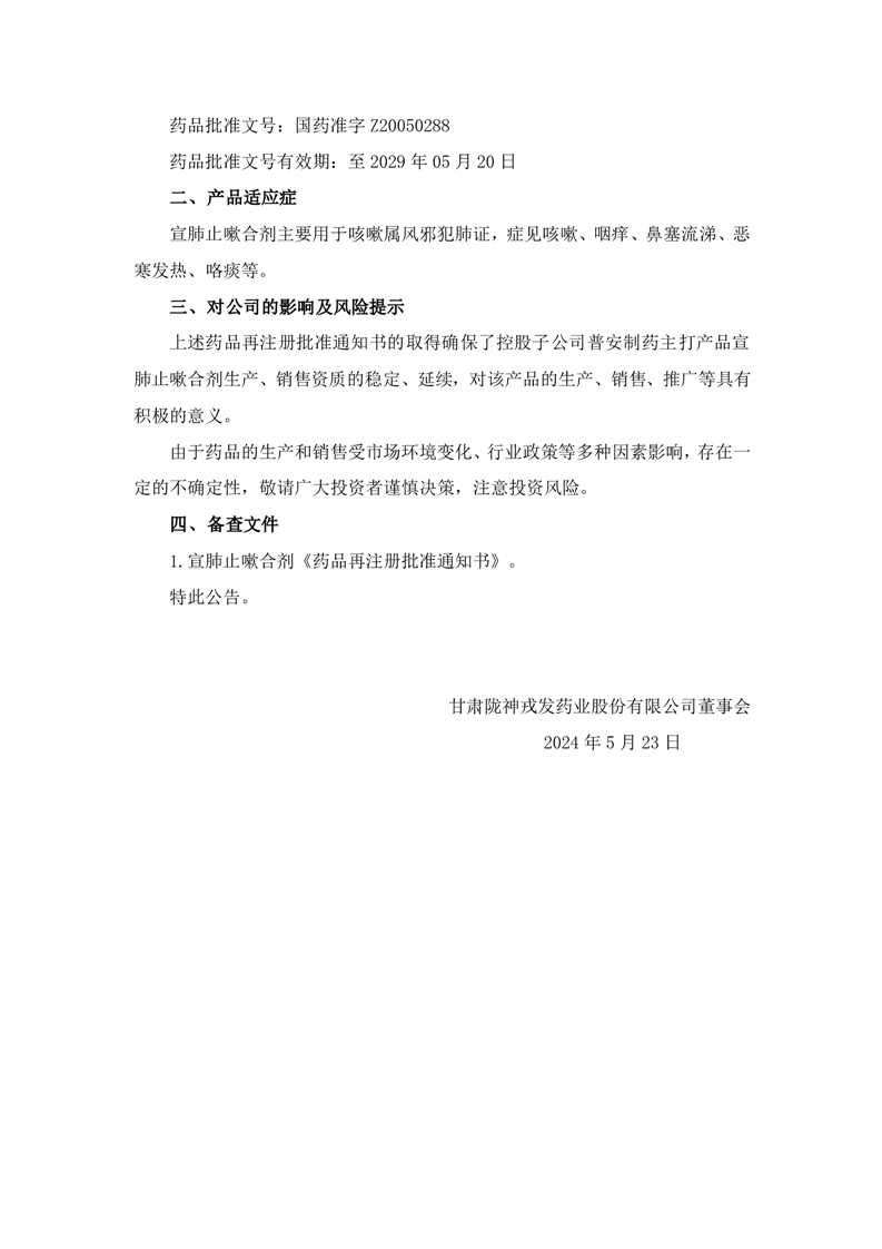關(guān)于宣肺止嗽合劑獲得藥品再注冊(cè)批準(zhǔn)的公告