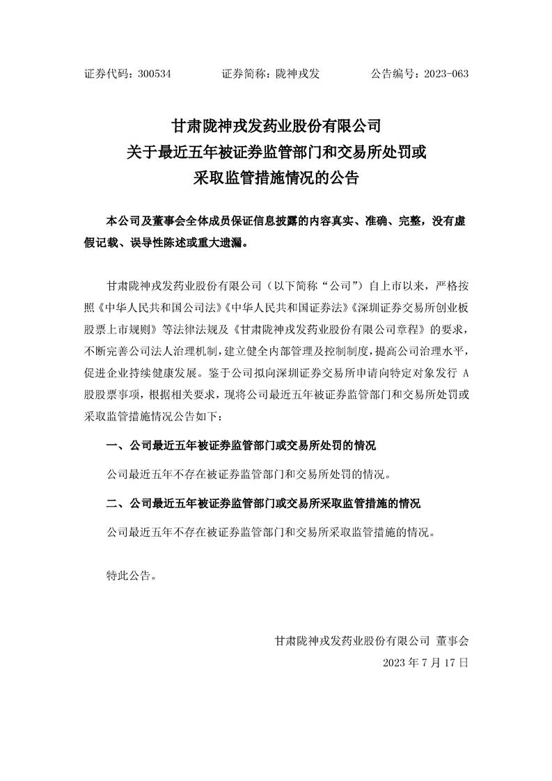 關(guān)于最近五年被證券監(jiān)管部門和交易所處罰或采取監(jiān)管措施情況的公告