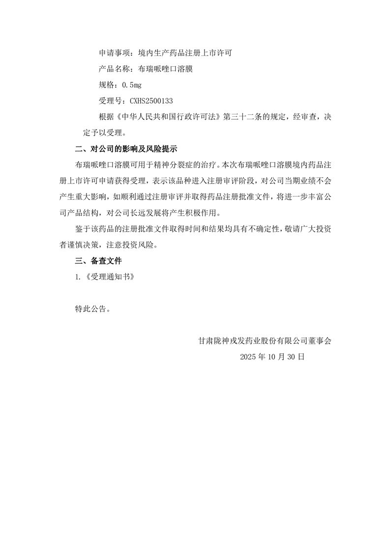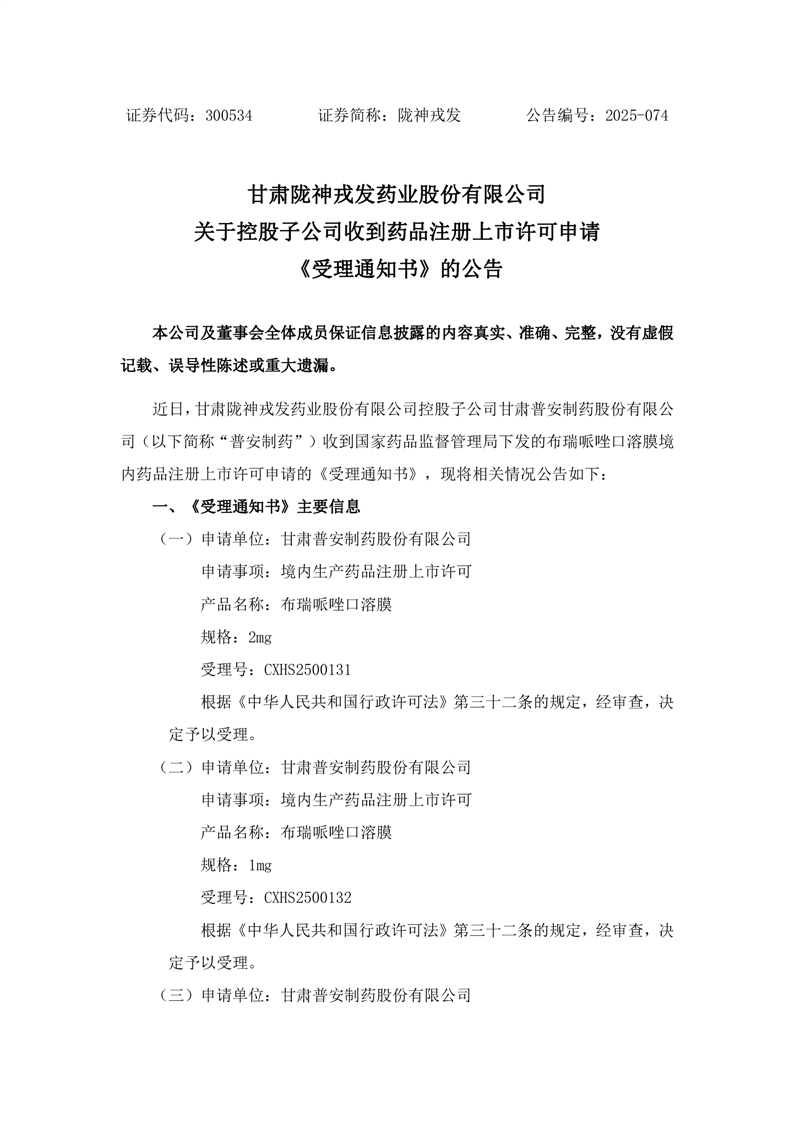 關于控股子公司收到藥品注冊上市許可申請《受理通知書》的公告