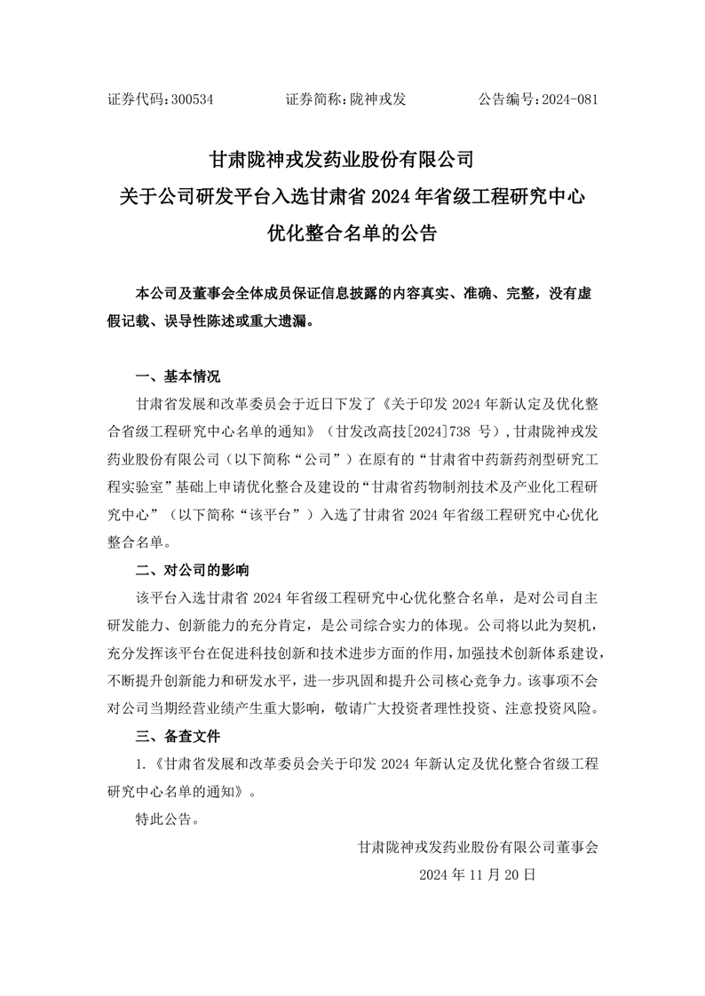關(guān)于公司研發(fā)平臺(tái)入選甘肅省2024年省級(jí)工程研究中心優(yōu)化整合名單的公告