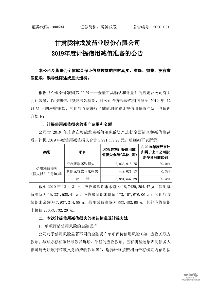 2019年度計提信用減值準備的公告