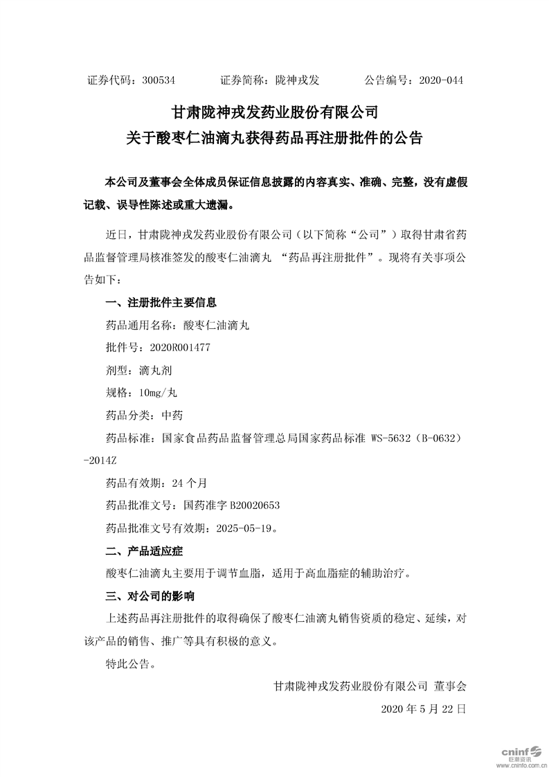 關(guān)于酸棗仁油滴丸獲得藥品再注冊批件的公告