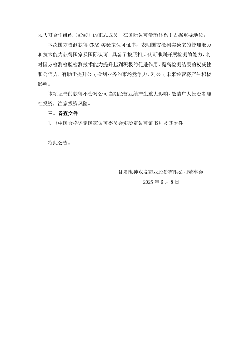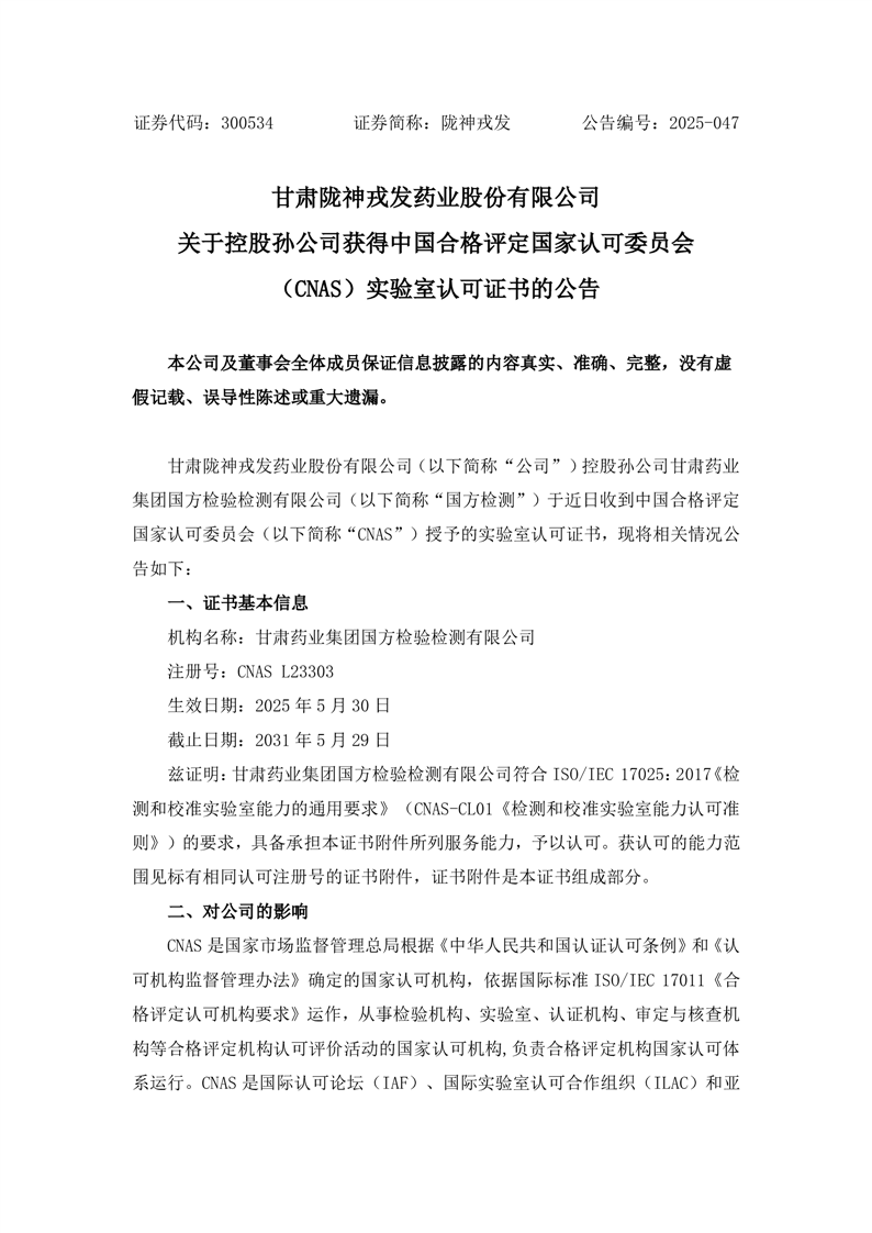 關于控股孫公司獲得中國合格評定國家認可委員會(CNAS)實驗室認可證書的公告