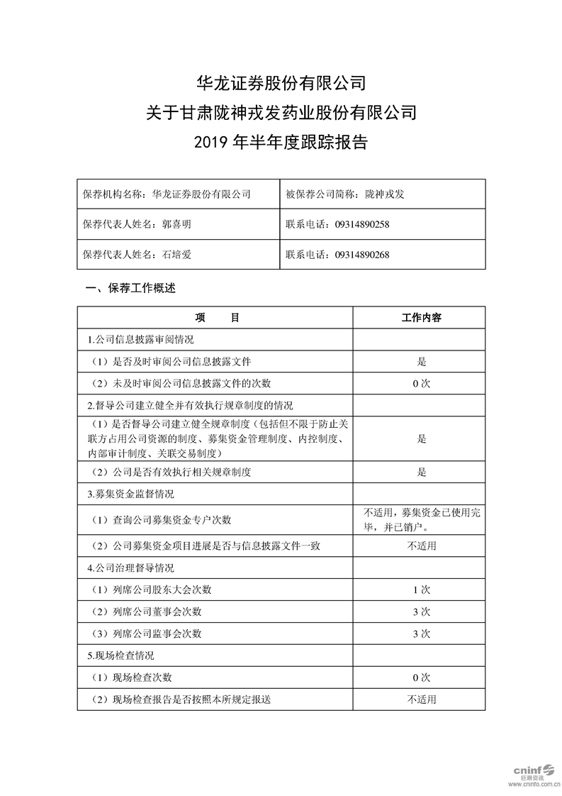 華龍證券股份有限公司關(guān)于公司2019年半年度跟蹤報告