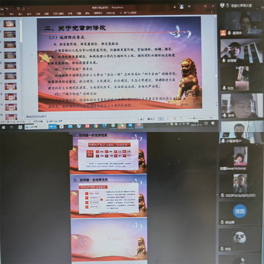 11月1日,受疫情影響隴神戎發(fā)機關(guān)黨支部以騰訊會議形式開展11月主題黨日活動,專題學(xué)習(xí)黨的二十大精神。會議傳達了《中共中央關(guān)于認真學(xué)習(xí)宣傳貫徹黨的二十大精神的決定》以及省委省政府、省政府國資委、甘肅藥業(yè)集團黨委和公司黨委關(guān)于認真學(xué)習(xí)宣傳貫徹黨的二十大精神的相關(guān)要求。公司黨委副書記康永紅同志為全體黨員深入解讀了習(xí)近平總書記在中國共產(chǎn)黨第二十次全國代表大會上的報告;黨委委員、紀委書記楊俊萍帶領(lǐng)全體黨員共同學(xué)習(xí)了《中國共產(chǎn)黨章程》(修正案決議)及《十九屆中央紀律檢查委員會向中國共產(chǎn)黨第二十次全國代表大會的工作報告》。