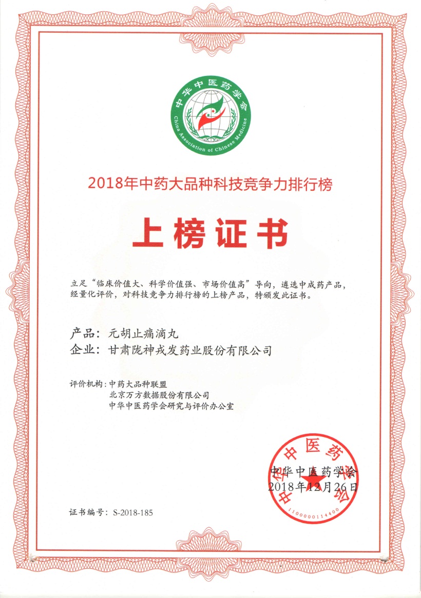 2018年12月26日,“第四屆中藥大品種聯(lián)盟論壇暨中藥大品種科技競爭力排行榜發(fā)布會”在北京召開。隴神戎發(fā)獨家產(chǎn)品元胡止痛滴丸成功上榜,并在 《甘肅省中藥大品種科技競爭力排行榜》(省區(qū)榜單)和《神經(jīng)系統(tǒng)用藥中藥大品種科技競爭力榜》(治療領域榜單)兩大榜單中分別位列第三名和第九名。