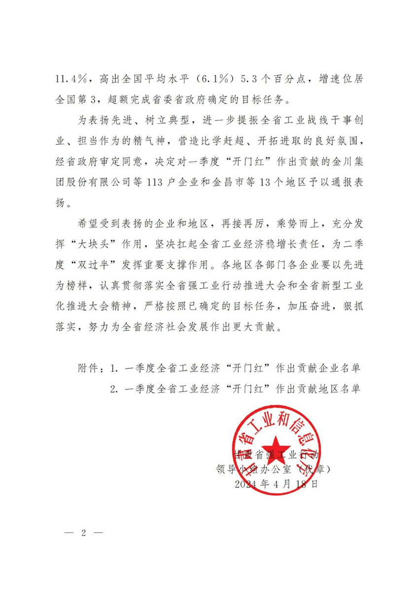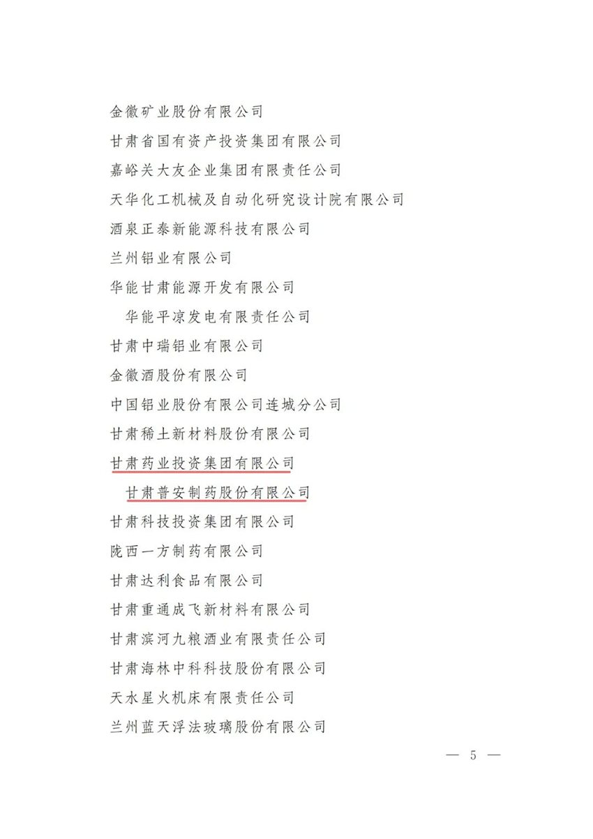 根據(jù)《甘肅省強工業(yè)行動領(lǐng)導(dǎo)小組辦公室關(guān)于表揚2024年一季度全省工業(yè)經(jīng)濟“開門紅”作出突出貢獻企業(yè)和地區(qū)的通報》(甘工信發(fā)〔2024〕96號),甘肅藥業(yè)集團及子公司普安制藥被省工信廳評為2024年一季度全省工業(yè)經(jīng)濟“開門紅”作出貢獻企業(yè)并給于通報表揚。