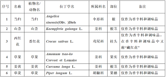 山柰、西紅花、草果、姜黃、蓽茇。在《中國(guó)藥典》(2015年版)收載。我國(guó)傳統(tǒng)將山柰、西紅花、草果、姜黃、蓽茇作為香辛料和調(diào)味品食用,且列入《香辛料和調(diào)味品 名稱》(GB/T 12729.1-2008)。在食藥物質(zhì)目錄中所列的基源植物和食用部分與《中國(guó)藥典》記載一致。