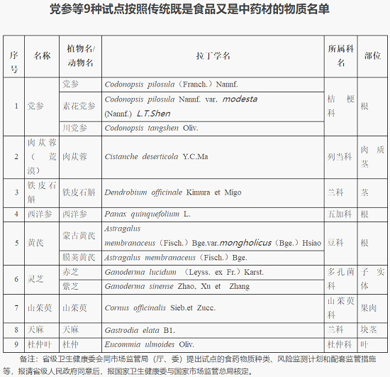 附件:黨參等9種試點(diǎn)按照傳統(tǒng)既是食品又是中藥材的物質(zhì)名單