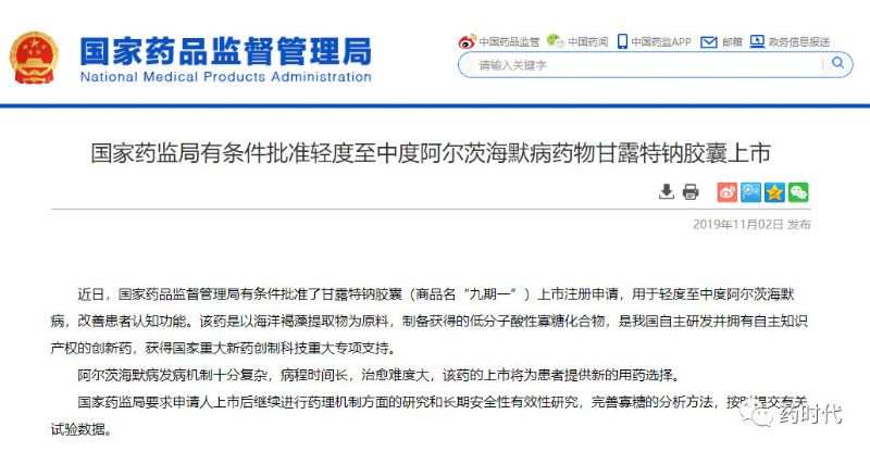 近日,國家藥品監(jiān)督管理局有條件批準(zhǔn)了甘露特鈉膠囊(商品名“九期一”)上市注冊申請,用于輕度至中度阿爾茨海默病,改善患者認(rèn)知功能。該藥是以海洋褐藻提取物為原料,制備獲得的低分子酸性寡糖化合物,是我國自主研發(fā)并擁有自主知識產(chǎn)權(quán)的創(chuàng)新藥,獲得國家重大新藥創(chuàng)制科技重大專項(xiàng)支持。