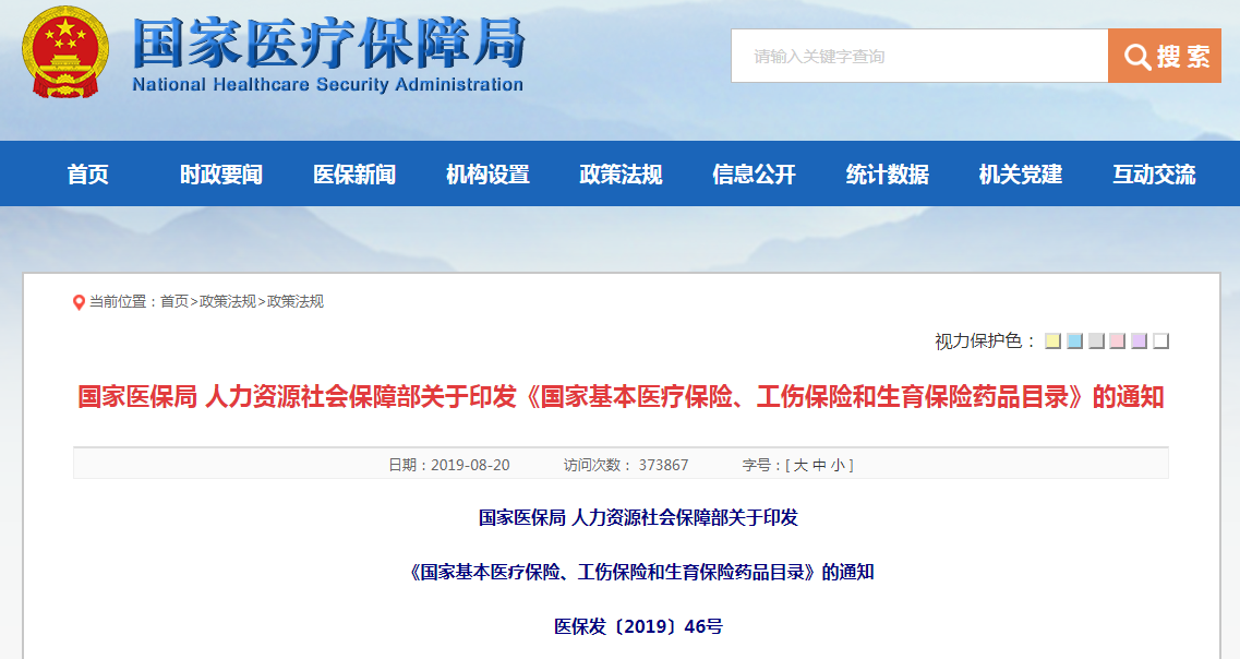 國家醫(yī)保局 人力資源社會保障部關于印發(fā) 《國家基本醫(yī)療保險、工傷保險和生育保險藥品目錄》的通知 醫(yī)保發(fā)〔2019〕46號