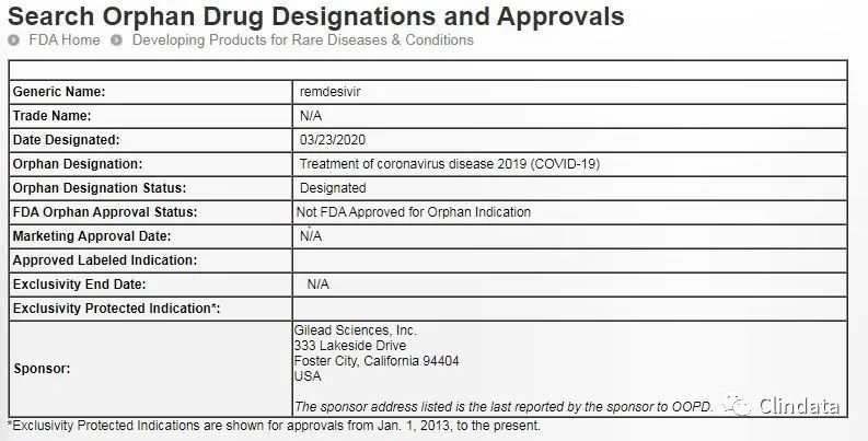 3月23日,F(xiàn)DA官網(wǎng)數(shù)據(jù)庫顯示,FDA授予吉利德科學(xué)(Gilead Sciences)公司開發(fā)的在研抗病毒療法瑞德西韋(remdesivir)孤兒藥資格(Orphan Drug Designation),其適應(yīng)癥為冠狀病毒疾病2019(COVID-19)。