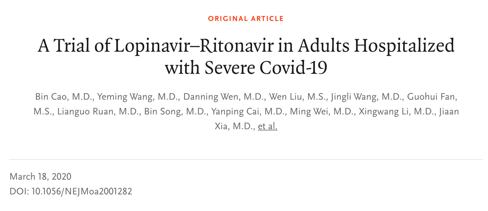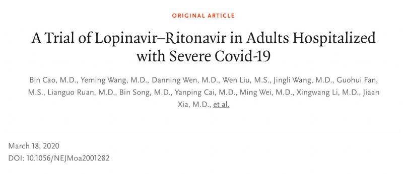 3月18日,眾所期待的洛匹那韋-利托那韋治療新冠臨床試驗結(jié)果,在《新英格蘭醫(yī)學(xué)雜志》上發(fā)布,結(jié)果讓人失望,在重癥患者中,與常規(guī)治療相比,研究未能觀察到洛匹那韋-利托那韋治療的有效性。