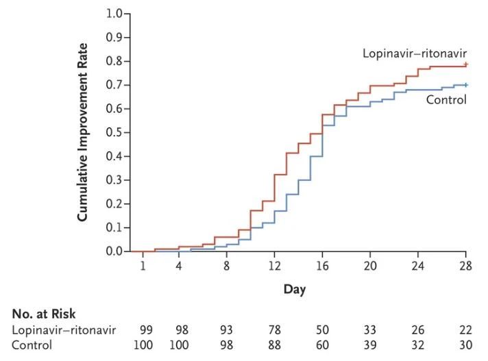 臨床癥狀改善:兩組患者出現(xiàn)臨床狀況改善中位時間相同,均為16天。洛匹那韋-利托那韋組與常規(guī)治療組患者的風(fēng)險比為1.31(95% 置信度,0.95-1.80),未能表現(xiàn)出顯著差異。