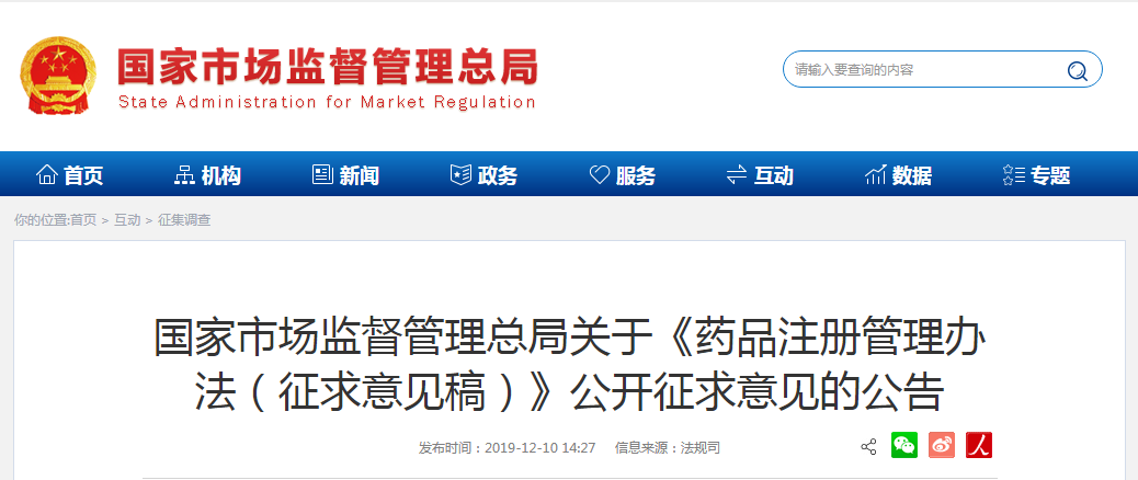 為貫徹落實新頒布的《中華人民共和國疫苗管理法》《中華人民共和國藥品管理法》,規(guī)范藥品注冊行為,保證藥品的安全、有效和質(zhì)量可控,現(xiàn)將國家藥監(jiān)局起草的《藥品注冊管理辦法(征求意見稿)》向社會公開征求意見,公眾可通過以下途徑和方式提出意見: