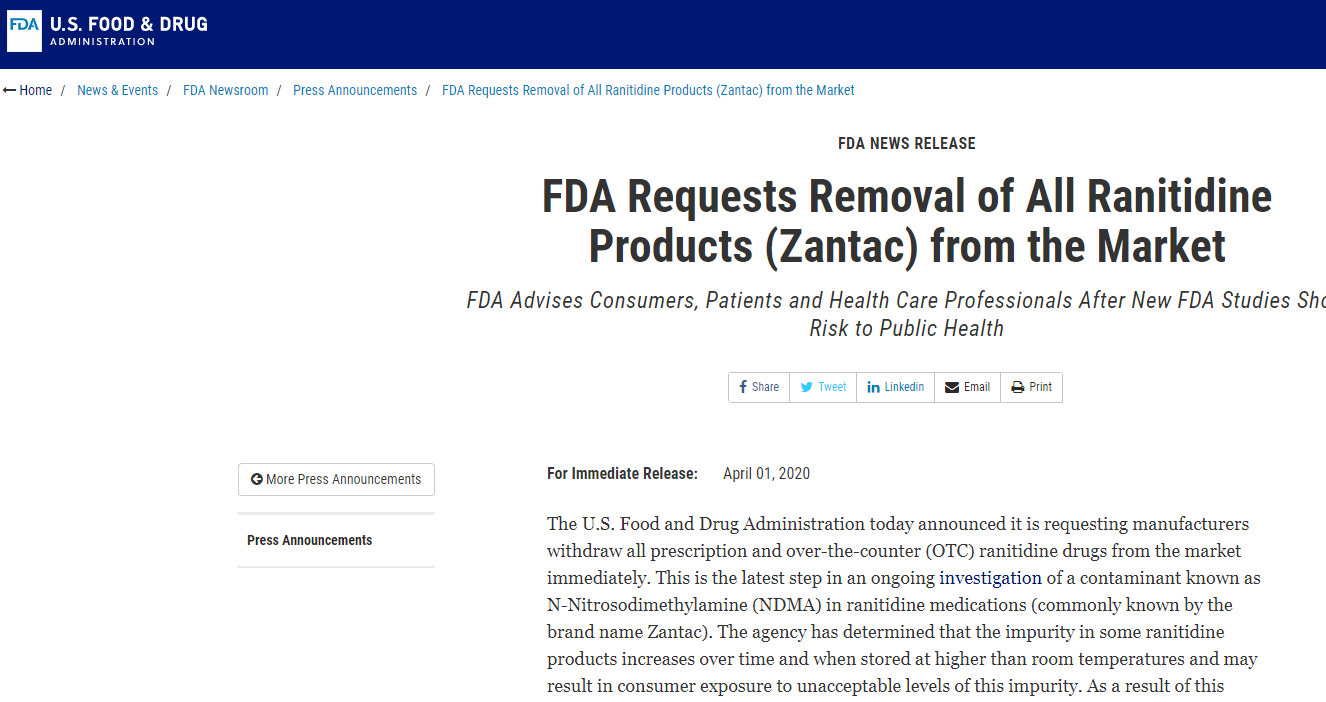 根據(jù)美國 FDA 官網(wǎng) 4 月 1 日的消息,F(xiàn)DA 要求所有藥企立即從下架所有雷尼替丁藥物,因在雷尼替丁中發(fā)現(xiàn)了一種可致癌的亞硝酸胺雜質(zhì)——N-亞硝基二甲胺(NDMA)。