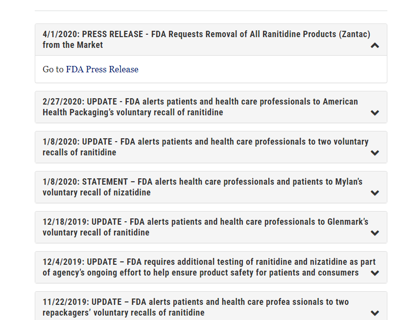 關(guān)于雷尼替丁中可能含有的致癌物,F(xiàn)DA 此前已經(jīng)發(fā)布了多次聲明。2019 年 9 月 13 日,F(xiàn)DA 在官網(wǎng)中第一次發(fā)布了提醒醫(yī)護(hù)人員/患者在雷尼替丁樣品中發(fā)現(xiàn)了 NDMA 的聲明。在當(dāng)時的聲明中,F(xiàn)DA 表示在幾個廠商的雷尼替丁藥品中發(fā)現(xiàn)了 N-亞硝基二甲基胺(NDMA),當(dāng)局正在評估正在評估雷尼替丁中低水平的 NDMA 是否對患者構(gòu)成風(fēng)險(xiǎn)。當(dāng)時,F(xiàn)DA 沒有要求患者停止服用替尼替丁,但建議可以換用與雷尼替丁有相同作用的其他藥品。